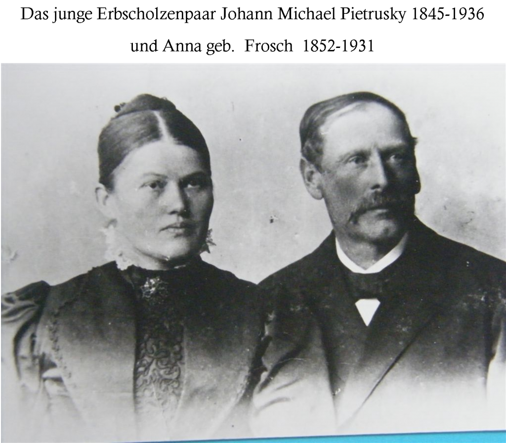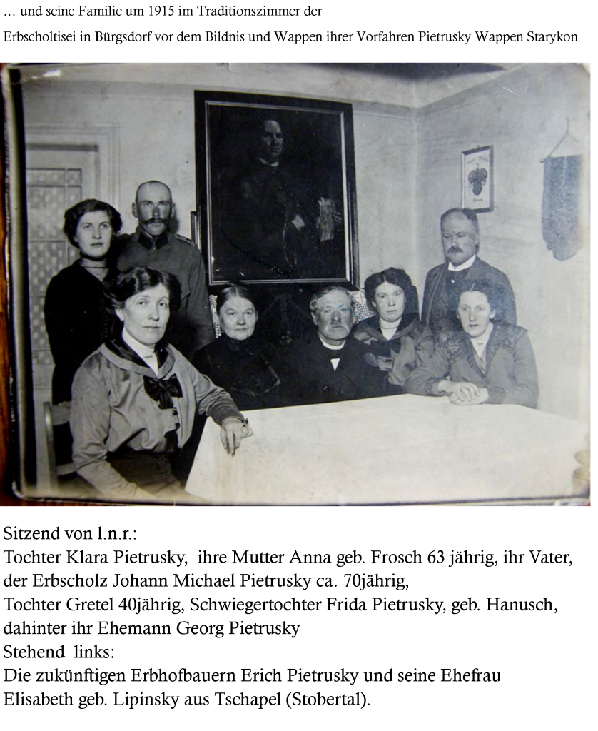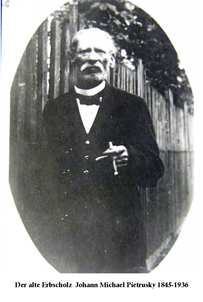 „Der Altbauer Johann Michael Pietrusky, geboren 1845 in Bürgsdorf, im Alter von 89 Jahren empfängt uns herzlich und nimmt an dem großen Geschehen im weiten deutschen Vaterlande den regesten Anteil, anschließend erzählt er uns stundenlang in geistiger Frische, wie die Pietrusky von hier aus in dreihundert Jahren das Wohl des Dorfes Bürgsdorf als Erb- und Gerichtsschulzen gelenkt haben.