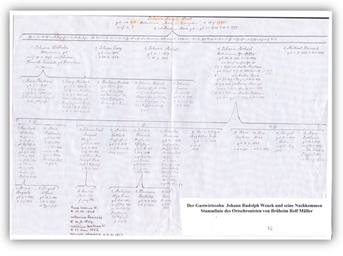 Am 2.6. 1795 heiratet der Gastwirth Michael Heinrich Wenck, * 1768 in Brüheim, Sohn des Gastwirts Michael Heinrich Wenck, * 1725 in Brüheim, + 1803 in Brüheim, die Tochter des Schenkwirts Johann Heinrich Wenck, * 1738-1805, Anna Magdalena Wenk, * 1774 in Brüheim, + 1805 in Brüheim