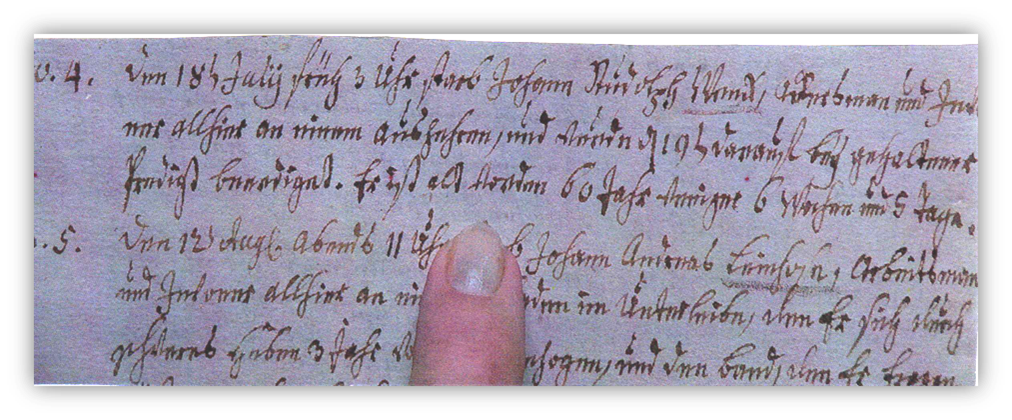 Den 18. July früh 3 Uhr starb Johann Rudolph Wenck, Ackermann und Inwohner allhier an einem Auszehren und wurde den 19. darauf bey gehaltener Predigt beerdigt. … Er ist alt geworden 60 Jahre weniger 6 Wochen und 5 Tage