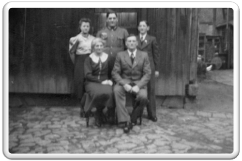 Die Familie Arno Paul Wietschel, Ehefrau Clara Martha geb. Ritter, und ihre Kinder Heinz, Ursel und Kurt im Hof ihres Hauses Johannisgasse 2 im Frühjahr 1940